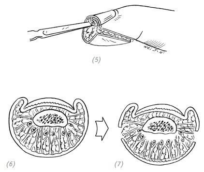 (5), (6), (7) распатором или скальпелем по ладонной поверхности дистальной фаланги отслаиваем мягкие ткани подушечки пальца от кости, оставляя нетронутым соединение мягких тканей с V-образным лоскутом.