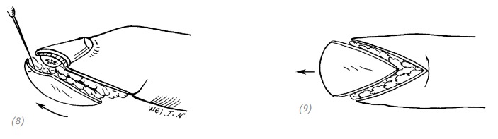 (8), (9), (10) косой дефект латеральной поверхности кончика пальца с лучевой стороны. В зависимости от размера дефекта выбираем направление питающей ножки и выкраиваем кожный лоскут из области мышц тенара большого пальца