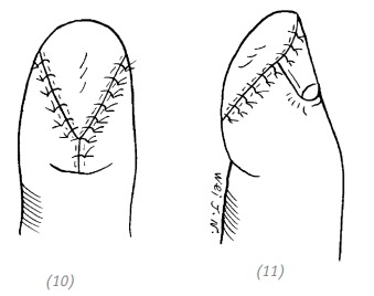 (10), (11) вначале сшиваем дистальный край V-образного лоскута с ногтевым краем раны. Затем накладываем Y-образный шов на проксимальную часть V-образного лоскута