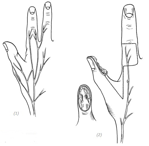 (1) анатомическое строение в области тыльной поверхности проксимальной фаланги указательного пальца (место будущего островкового лоскута); (2) разрез
