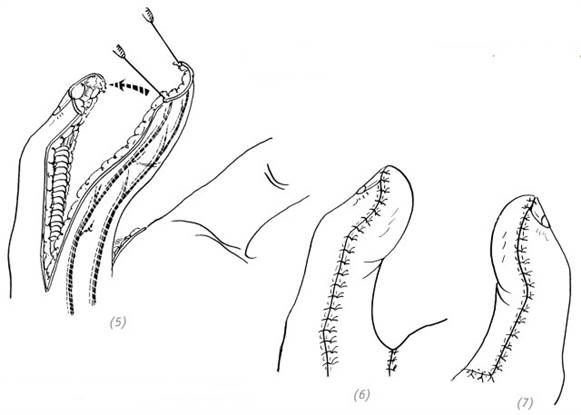 (5) сместить вверх отсепарированный кожный лоскут и укрыть им дефект на кончике большого пальца (6), (7) согнуть дистальную фалангу большого пальца, наложить швы на кожный лоскут