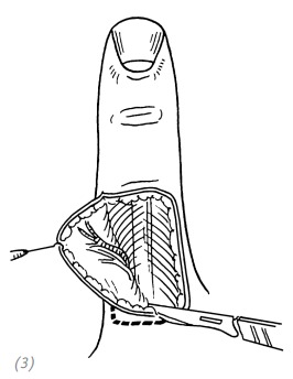 (1) локтевая сторона кончика (ногтевой фаланги) большого пальца; (2) на основании величины дефекта на лучевой стороне у основания проксимальной фаланги указательного пальца выкраиваем кожный лоскут с последующей его реверсией. Питающая ножка располагается на лучевой стороне пальца; (3) выкраиваем кожный лоскут для закрытия вторичного дефекта донорской зоны в соответствии с её размерами