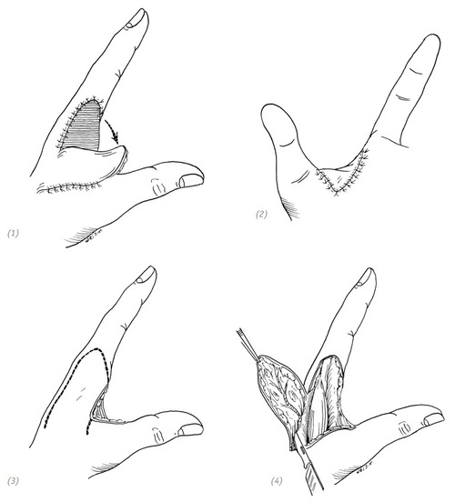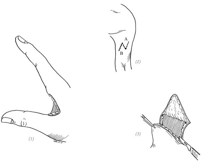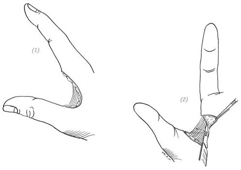 (1) линии разреза на коже тыльной поверхности указательного пальца. Выкраиваем кожный лоскут на ножке; (2) отсепарировать кожный лоскут; (3) кожный лоскут переместить на ладонную поверхность дефекта первой межпальцевой складки. Вторичный дефект донорской зоны закрыть свободным кожным лоскутом; (4) наложить швы на кожный лоскут