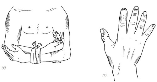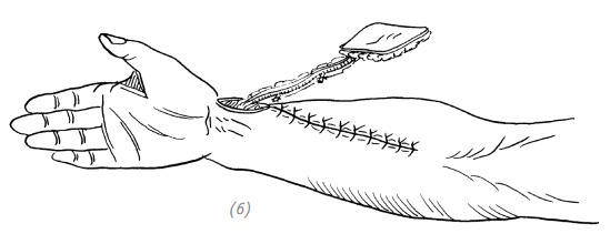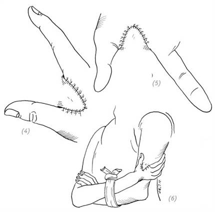 (4), (5) поместить повреждённую кисть на противоположное плечо, кожные лоскуты последовательно подшить к тыльной и ладонной поверхностям первой межпальцевой складки; (6) пластырем или бинтом зафиксировать обе руки между собой на уровне предплечий