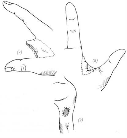 (7) через 4–5 недель после операции пересечь питающие ножки кожных лоскутов. При пересечении питающей ножки тыльного лепестка дополнительно выкроить маленький треугольный лоскут; (8) выполнить разрез в области основания ладонного лепестка межпальцевой складки и вшить туда этот маленький треугольный лоскут; (9) вторичный дефект кожи на плече закрыть свободным кожным лоскутом