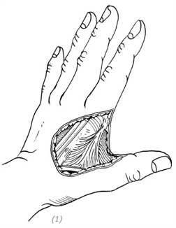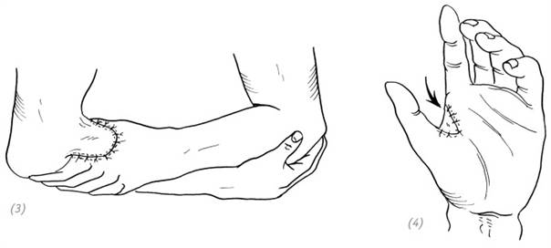 (3) кожный лоскут подшить к дефекту межпальцевой складки; (4) через 4–5 недель пересечь питающую ножку. Одновременно из основания лоскута выкроить небольшой треугольник и подшить его к ладонному лепестку межпальцевой кожной складки