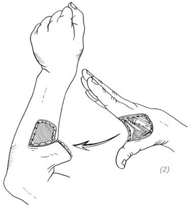(2) выкроить кожный лоскут на тыльной поверхности лучевой стороны противоположного предплечья