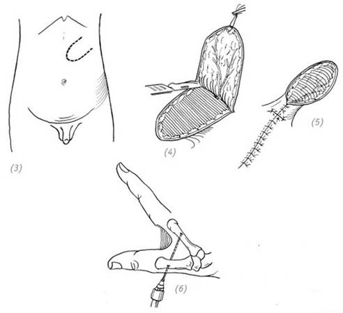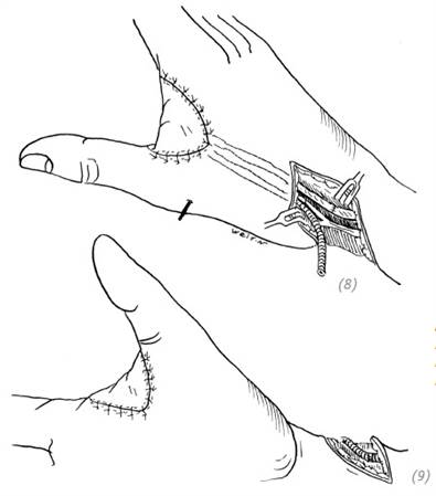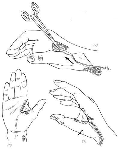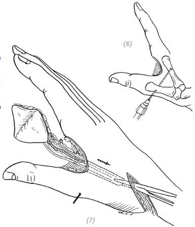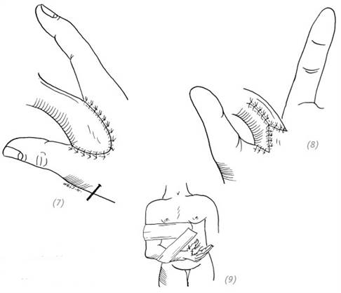 (6) введение повреждённого пальца в кожную трубку и ушивание. После операции – асептические повязки и фиксация оперированной конечности; (7) отсечение ножки кожного лоскута через 5–6 недель после операции