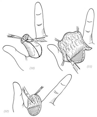 (10) через 6 недель после операции пересечь питающую ножку; (11) при помощи дополнительных разрезов превратить в плоский кожный лоскут; (12) иссечь излишки подкожно-жировой клетчатки кожного лоскута, придать ему форму и размеры дефекта
