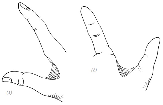 (1) дефект кожи первой межпальцевой складки; (2) для удобства подшивания кожного стебля на ладонной поверхности в области первой межпальцевой складки выкроить небольшой треугольный лоскут на ножке