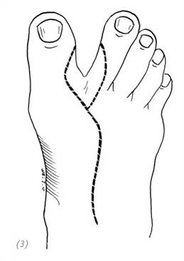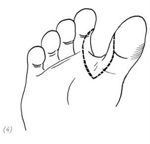 Рис. 3–28. Восстановление дефекта кожи первой межпальцевой складки пластикой посредством свободного лоскута первой межпальцевой складки стопы