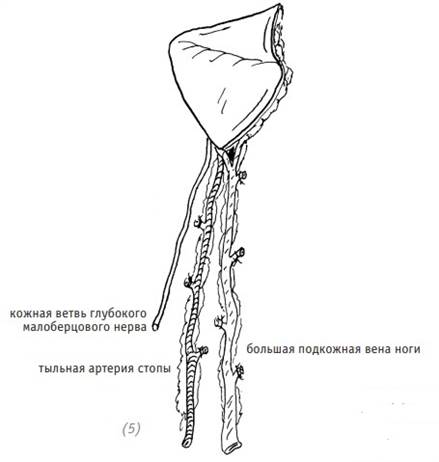 (3), (4), (5) на основании размеров и формы дефекта в области кожной складки между первым и вторым пальцами стопы выкроить кожный лоскут. Нейроваскулярная ножка представлена дорзальной артерией, большой подкожной веной и глубоким малоберцовым нервом