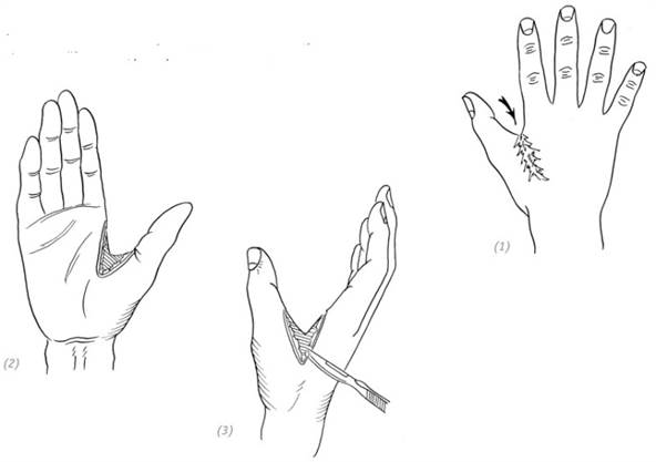 (1) рубец в области кожи первой межпальцевой складки;(2), (3) иссечение рубца, расширение раневой поверхности