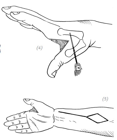 4. В области запястья выполнить надрез и выделить лучевую артерию, латеральную подкожную вену руки и поверхностную ветвь лучевого нерва. Проделать достаточно широкий подкожный туннель от места надреза до дефекта в области первой межпальцевой складки.
