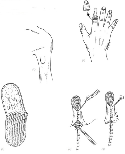(1) отрыв кожи средней и дистальной фаланги указательного пальца; (2) моделирование стебельчатого – трубчатого кожного лоскута на медиальной поверхности контралатерального плеча в соответствии с длиной и окружностью кожного дефекта пальца; (3) выкраивание кожного лоскута; (4) формирование стебельчатого – трубчатого кожного лоскута на одной ножке, сшивание подкожного и кожного покровов. Ушивание донорской зоны; (5) ромбовидная ножка зашивается кисетным швом (прим. редактора: рекомендация автора)