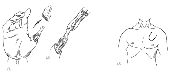 (1) отрыв кожи большого пальца в виде рукава (прим. редактора: по типу чулка); (2) во время обработки раны бугристость дистальной фаланги пальца надлежащим образом усекается, чтобы палец не выглядел чрезмерно длинным после отделения от ножки лоскута; (3) моделирование стебельчатого – трубчатого кожного лоскута на груди или плече с контралатеральной стороны в соответствии с длиной и окружностью кожного дефекта пальца