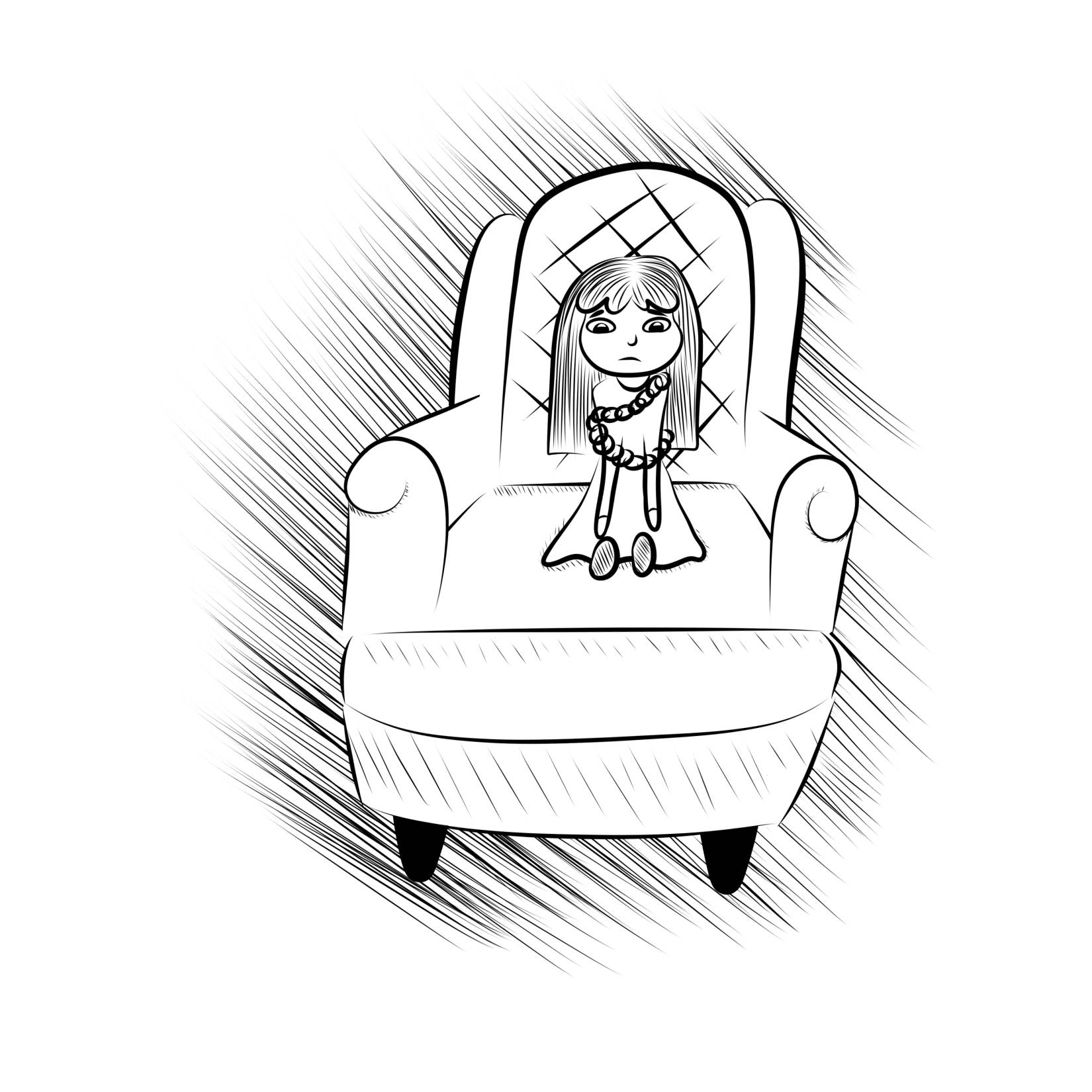 Выглянув из-за стены, она увидела свою сестру, сидящую на большом красном кресле, перевязанную золотыми цепями.