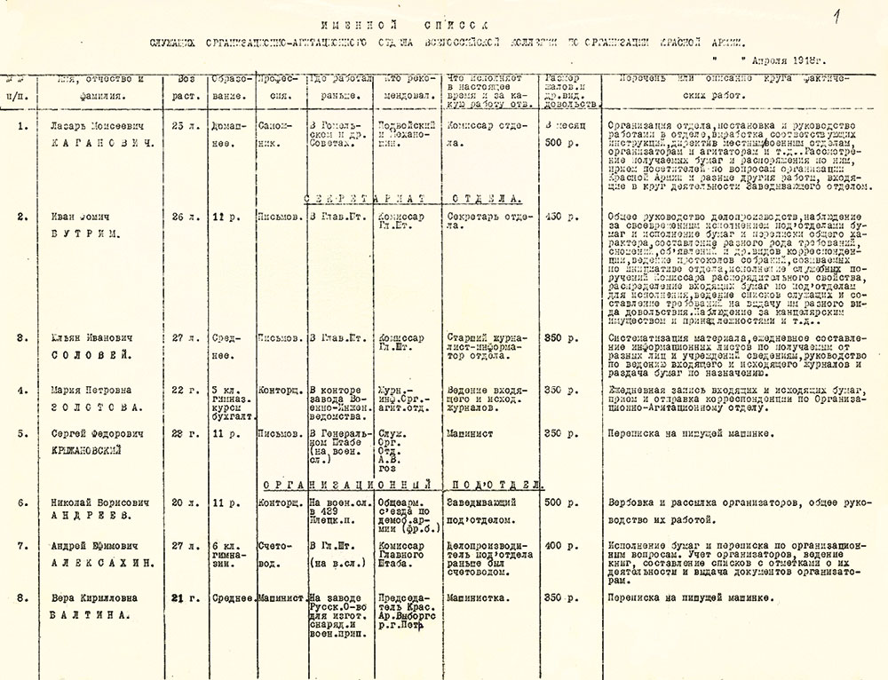 Из именного списка служащих организационно-агитационного отдела Всероссийской коллегии по организации Красной армии Апрель 1918 [РГАСПИ. Ф. 81. Оп. 3. Д. 413. Л. 1]