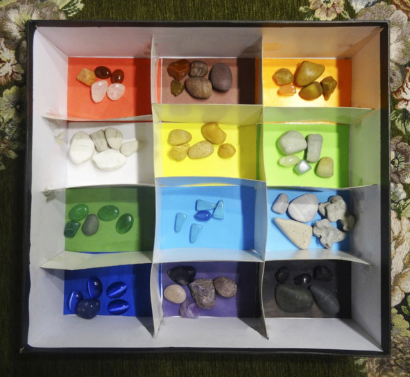 Тут же была большая шкатулка, разделенная внутри на двенадцать отделений. Дно каждого выложено цветной бумагой определенного цвета: красного, коричневого, оранжевого, белого, желтого, бледно-зеленого, темно-зеленого, бирюзового, голубого, синего, фиолетового, черного. В каждом отделении по пять камушков того же цвета.