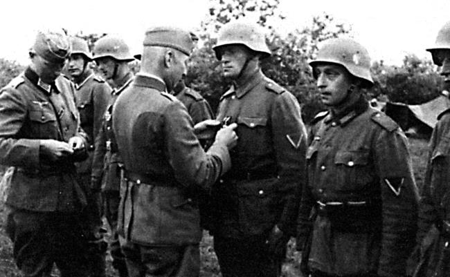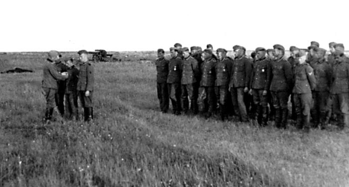 Личный состав 10-й батареи построен для награждения. Командир батальона, подполковник Бальтазар, прикалывает Железный крест второго класса на грудь фельдфебеля, ефрейтора и связиста. Большинство солдат батареи были ветеранами с опытом Восточного фронта
