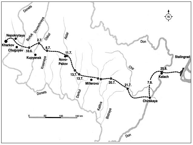 Путь 71-й пехотной дивизии в летней кампании 1942 года был отмечен серией тяжелых маршей по голой степи и многочисленными переправами. Дивизия вновь попала на восточный фронт перед кризисом во время почти победоносного советского наступления под Харьковом в мае 1942 г. Силы батарей 171 – го артполка, так недавно пополненного во Франции, таяли в мелких операциях. Некоторые воевали под Изюмом, другие под Харьковом, но всем доставались трудные задачи, такие как борьбы с танками или поддержка быстро движущихся разведывательных подразделений. Тем не менее потенциальное поражение стало победой. Потом началась собственно летняя кампания. Наступление на Сталинград через Оскол и Дон означало, что артиллерия применялась традиционным способом, но на людей и лошадей возлагались непосильные задачи. Эти битвы, иногда превращавшиеся в спешную погоню, доставляли проблем и обозам снабжения, которые по ночам шли следом, потому что им приходилось биться за свою жизнь с русскими формированиями, отставшими за день. Когда они вышли к Дону напротив Калача, сила этого сектора – вкупе с приподнятым западным берегом – а также измотанностью войск, – делала его идеальным местом для зимовки. Но так не должно было быть. Нужно было выйти еще к одной реке.