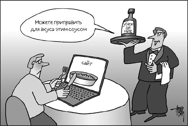 Если, однако, вам требуются оптимальные результаты в Сети, то, чтобы убедить людей, понадобится нечто большее, чем просто обеспечение удобства для пользователя. Вообще-то, термин «пользователь» не слишком удачен. Он предполагает наличие по другую сторону экрана мотивированного человека, который уже принял решение вести с вами дела и пользоваться вашим сайтом. Давайте так же критически оценим термин «карта путешествия клиента»: что вы имеете в виду под словом «клиент»? Это еще надо обсудить.