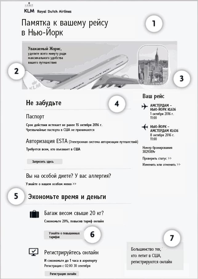 Давайте приведем практический пример. Рассмотрим рассылку, которую Жорис и его команда разработали для KLM. Это электронное сообщение, которое люди получают за две недели до отлета.