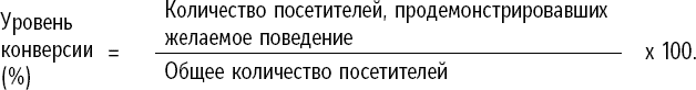 КОНВЕРСИЯВ этой книге мы часто употребляем слово «конверсия». Вы, как онлайн-профессионал, наверняка знаете, что оно означает, однако для тех, кто «не в теме», мы хотели бы сказать несколько слов. Уровень конверсии – это мера убедительности в сетевом пространстве, которая рассчитывается как количество посетителей, продемонстрировавших желаемое поведение, деленное на общее количество посетителей, и выражается в процентах.