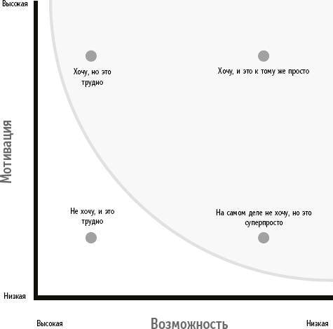 Разумеется, справедливо и обратное: если ваша мотивация очень низкая, вас все еще можно убедить что-то сделать, сильно расширив возможность. Например, когда вы гуляете по торговому центру, всегда встречаются этакие дружелюбные студенты, раздающие бесплатные газеты. Даже если у вас дома уже есть газета и вам не нужна еще одна, иногда вы все же ее берете. Почему? А возможность просто небывалая: всегда проще взять газету, чем отказаться. Если один из факторов очень сильный, этого может быть достаточно для компенсирования другого, менее сильного. Дизайн поведения как раз и занимается подобными взаимозависимостями (рис. 1.4).