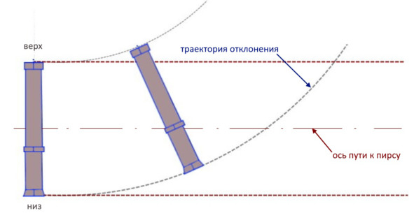 (*) – Во время накатки балки «покаты» одновременно утратили опору в средней своей части и опирались одним концом на край пирса, вторым – на середину палубы. В этот момент колонна находилась над палубой, но не достигла середины её.