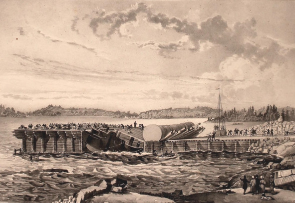 28 балок, служивших переходом для монолита, из-за движения корабля одновременно оказались на весу (*). Не в силах больше выдерживать такой огромный вес, все эти балки разом сломались, а затем колонна врезалась в их обломки. При первом же треске древесины подрядчик и его отец, а также рабочие, прокладывавшие канаты, поспешно отступили, так что этот несчастный случай, который для многих людей мог оказаться смертельным, не стоил жизни никому, и, что самое необычное, никто не пострадал.