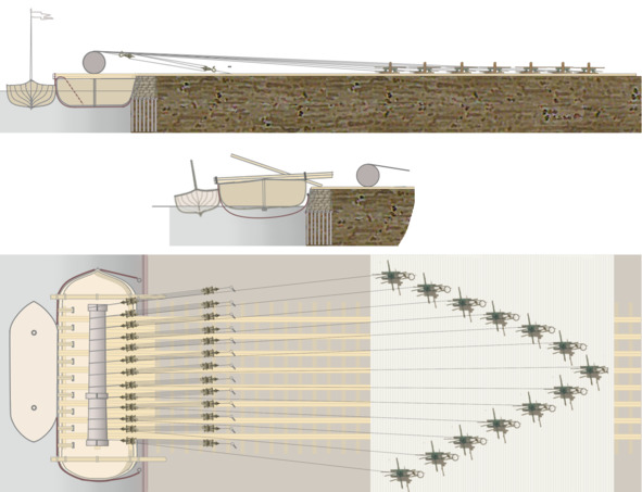 Завершив эту работу, г-н Яковлев приказал по всей длине колонны разместить рядом (бок о бок) тридцать пять балок, которые соединяли причал с судном. Одиннадцать из этих балок проходили под колонной и пересекали палубу судна, на концах которого всё ещё были закреплены шесть других очень больших балок, связанных вместе и опиравшихся одним концом на причал, на который они заходили на шесть футов, а с другой стороны – на второе тяжело нагруженное судно, назначением которого было создание противовеса, который предотвращал бы опрокидывание во время выгрузки. Судно также охватывали и надёжно прикрепляли к причалу двенадцать канатов. Двадцать кабестанов были расставлены таким образом, что четырнадцать из них должны были тянуть колонну на берег, а остальные шесть – удерживать судно.