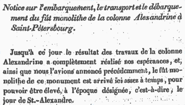 Те, кто не имел возможности узнать, какие трудности понадобилось преодолеть для погрузки и выгрузки этой гранитной массы, несомненно, с интересом прочтут следующие подробности, касающиеся этих операций. Чтобы лучше оценить это великое предприятие и заслуги человека, которому оно было поручено, мы считаем необходимым прежде всего сообщить нашим читателям, что во время своих частых поездок в Финляндию для работы над 48 колоннами церкви Св. Исаакия г-н де Монферран, главный архитектор монумента, продолжающий его строительство, заметив гранитный блок длиной 100 футов (30,5 м), задумал использовать его для украшения столицы. Этот художник, который на протяжении 12 лет продолжал привлекать внимание к этому необычному монолиту, (уже едва было не) отчаялся использовать его, когда его пригласили представить проект памятника, призванного увековечить память покойного императора АЛЕКСАНДРА. Возможность была благоприятной; г-н Монферран предложил (в качестве второго варианта) колонну, цельный ствол которой был бы высотой 84 фута и 12 футов в диаметре (*). Подобный памятник, который превзошёл бы всё, что в этом жанре создали древние и современные мастера, соответствовал взглядам Его Величества ИМПЕРАТОРА; его утвердили.
