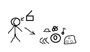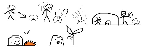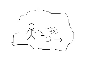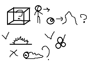 Но первый вопрос был задан без применения закрепляемого смыслового вопросительного символа: изобразив фигурку человечка и рядом свой кружочек, он добавил изображению сталкера трехмерный цилиндр в правую и, идентичный по форме зубец – один из очевидных инструментов для забора образцов, в левую. Закончив дорисовки элементов, малыш кропотливо провел линию от человечка по направлению к своей фигуре.