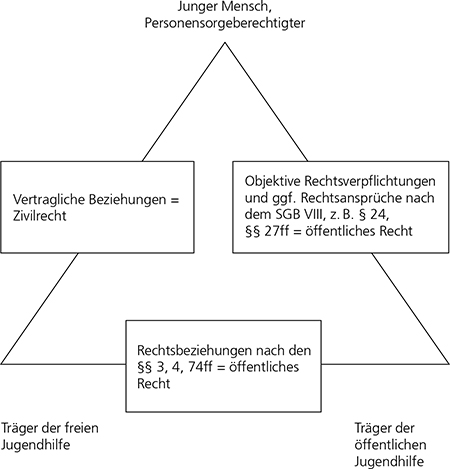 Im Verhältnis zwischen jungen Menschen und Personensorgeberechtigten, den Trägern der öffentlichen Jugendhilfe und den Trägern der freien Jugendhilfe besteht häufig das so genannte sozial- oder jugendhilferechtliche „Dreiecksverhältnis“. Dabei bestehen drei unterschiedliche, sorgfältig voneinander zu unterscheidende Rechtsbeziehungen (siehe auch Abbildung 1 sowie im Einzelnen: Münder et al. 2013, VorKap. 5, Rz. 6 ff.; Wabnitz in GK-SGB VIII, § 2, Rz. 39 f.), nämlich: