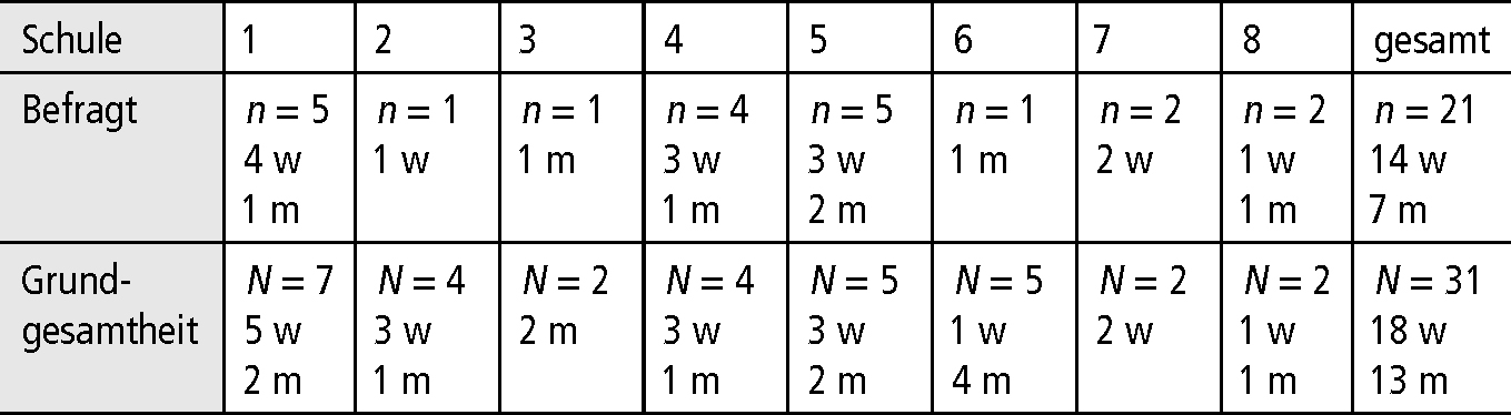 Anders als angestrebt, konnte aufgrund technischer und organisatorischer Probleme nicht die Gesamtheit der Sekundarschullehrkräfte einbezogen werden. Bei einer Grundgesamtheit von 31 Lehrkräften wurden 28 Lehrerinnen und Lehrer interviewt (18 weiblich, 10 männlich); zur Auswertung liegen 21 Audioaufzeichnungen vor (14 weiblich, 7 männlich).