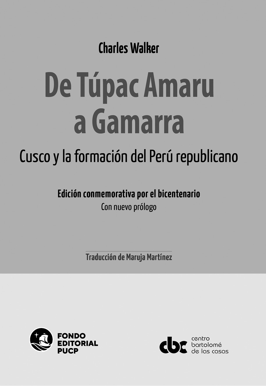 Para el Centro Bartolomé de Las Casas y la Pontificia Universidad Católica del Perú es una satisfacción y alegría presentar a la ciudadanía peruana el libro De Túpac Amaru a Gamarra. Cusco y la formación del Perú republicano, una edición conmemorativa por el bicentenario. Esta publicación constituye un texto valioso, leído y consultado por muchos para el conocimiento de la historia social y política del Cusco y del Perú. Su autor, el historiador Charles Walker, ha encontrado información poco conocida o inédita, con lo cual ha logrado construir una imagen más detallada del complicado entramado social y político del Perú colonial tardío y, sobre las cenizas del virreinato, de un nuevo Estado nacional que pretendió una institucionalidad independiente y soberana. Su esfuerzo narrativo y analítico revela aspectos inesperados que superan las antiguas visiones de la independencia del Perú y cuestionan ideas preconcebidas sobre los idearios de los constructores de la patria.