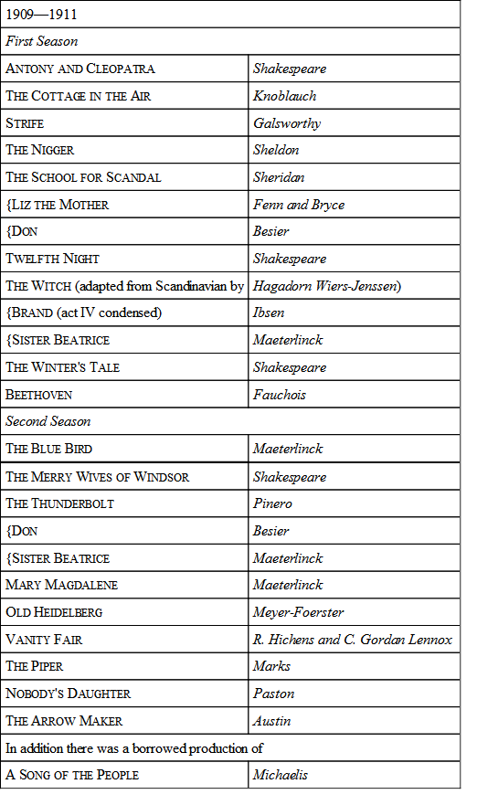 Mr. John Palmer, in his book, "The Future of the Theater," gives the following as the programme for the then, 1913, projected National Theater. The war intervened, however, and the venture has been lost sight of for the moment. This statement is even more reasonable than that of Mr. Archer, for this is intended for practical use in England while his was merely taken from France.