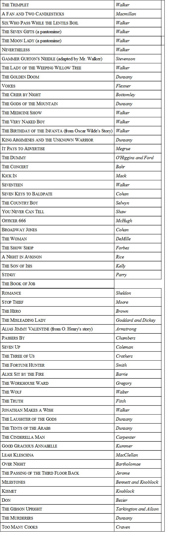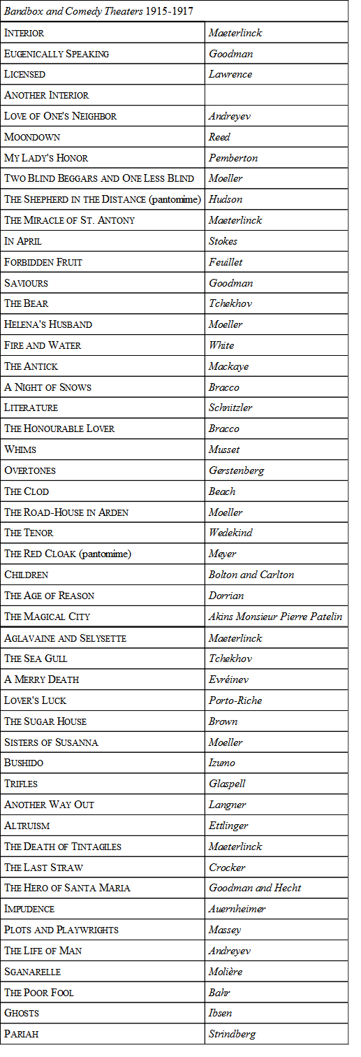 Taken from Prof. Dickenson's book, "The Insurgent Theater," in which a number of interesting and more recent repertories of "independent" theaters are given.