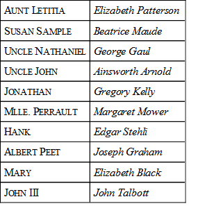 At the Princess Theatre, New York première, September 11, 1918, Elizabeth Patterson played Aunt Letitia, which was played in Indianapolis by Judith Lowry.