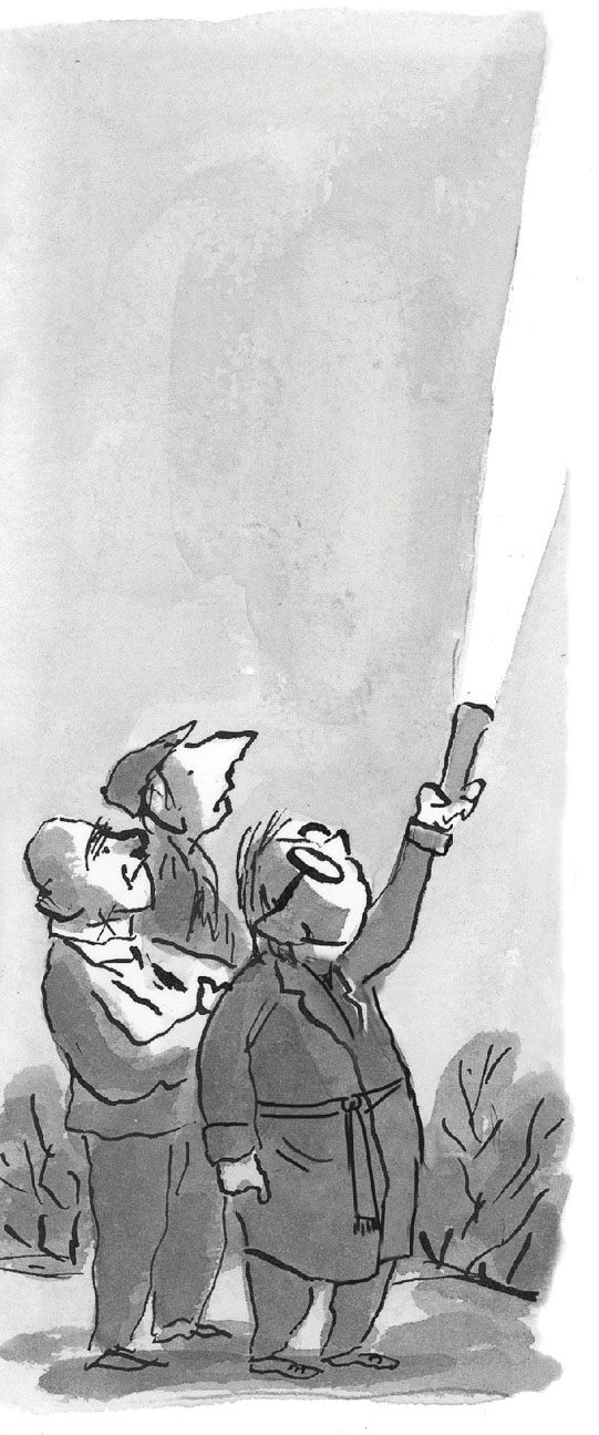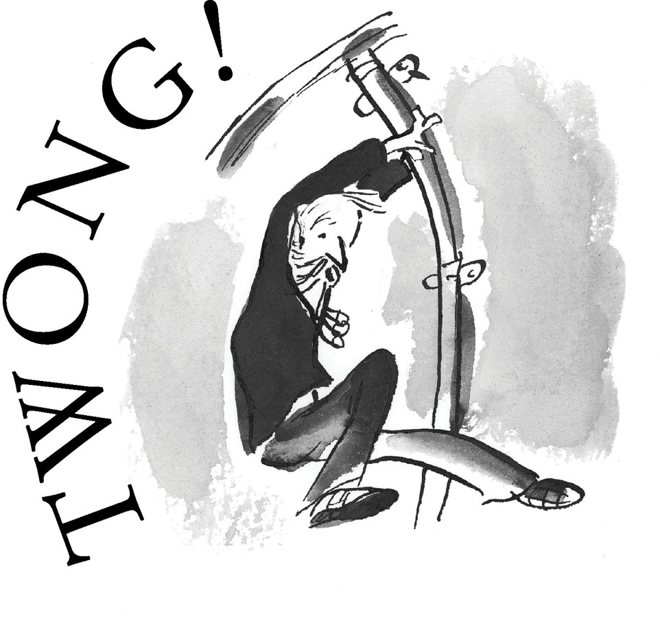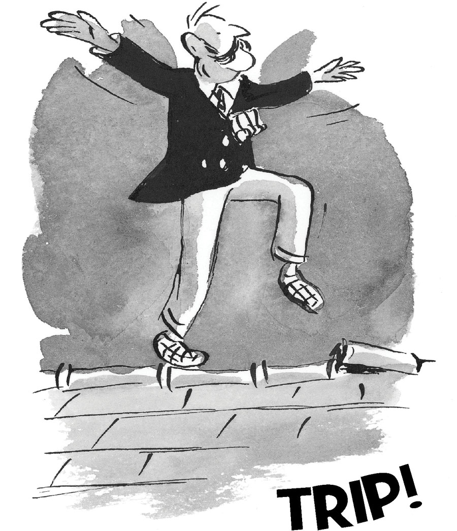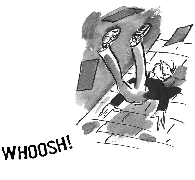 The old man clambered down the spire on to the roof. For a moment he stood still on the narrow peak, then without a care in the world he walked along it. But the piece of lead he had dislodged on his way up had left a dent in the roof so after just a few paces…