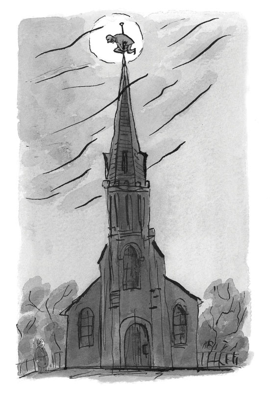 As the church came into view, there was the distinct silhouette of a man sitting on top of the spire. He was perfectly framed by the glow of a low silvery moon.