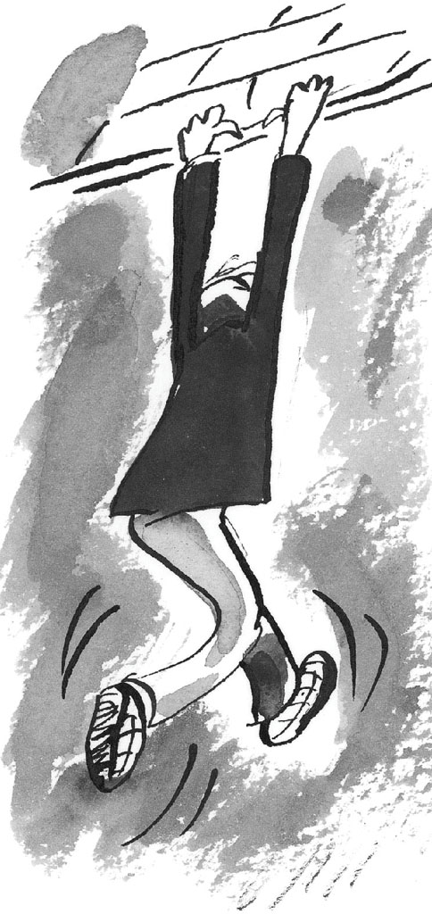 But at that moment, without making a fuss, the old man managed to grab on to the guttering and came to a stop. His thin legs swayed in the night air, his slippers bumping against the stained-glass window of the church.