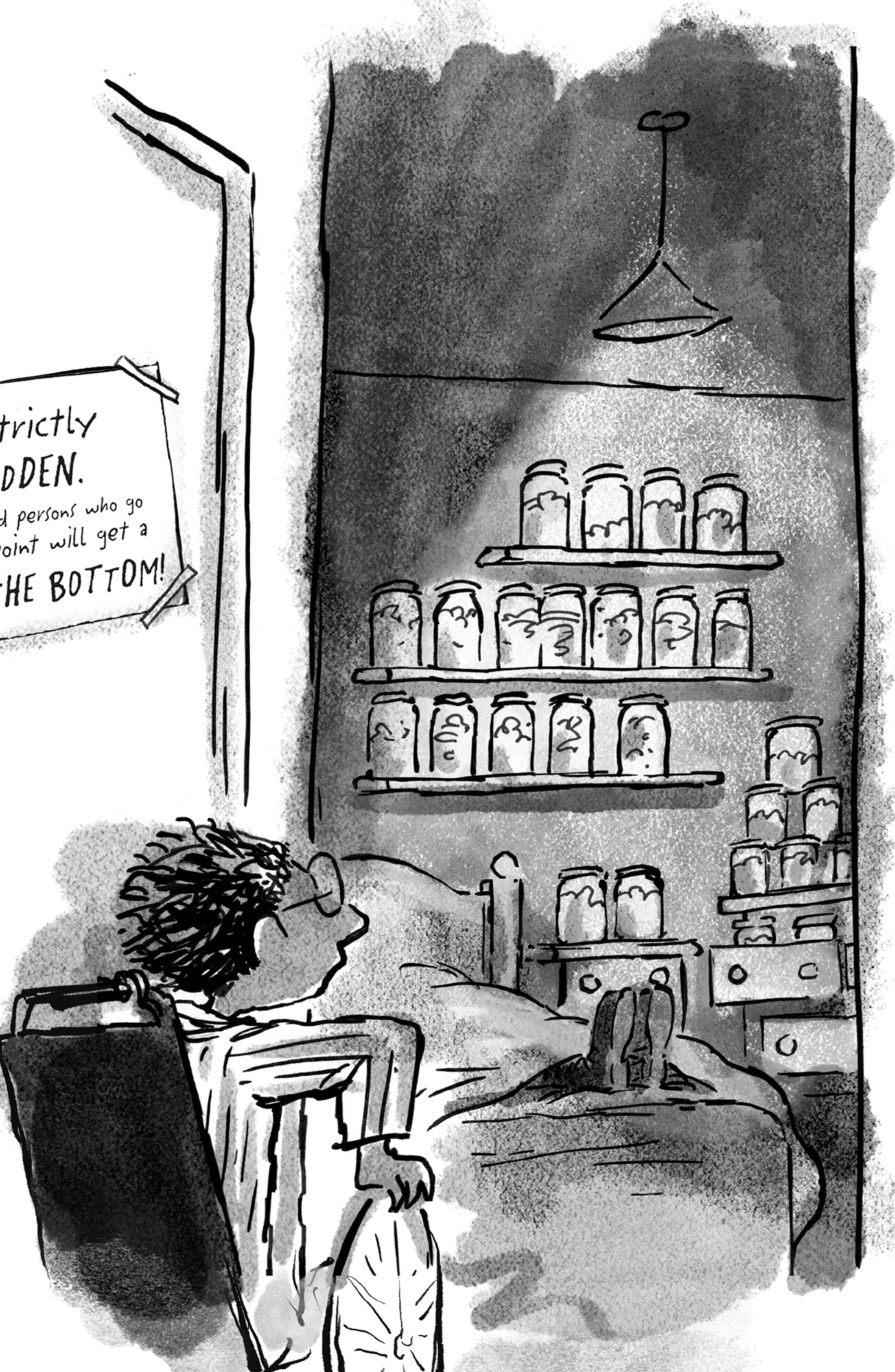 The boy hadn’t been allowed in his sister’s bedroom for years. No wonder she kept everyone out. Her room was full to bursting with jars and jars and more jars of gunk! There must have been thousands upon thousands of jars in there. All the way from the floor to the ceiling. No wonder Jemima had resorted to hiding the jars all over the house. There was no more room in her room! It was a miracle she could even get in or out!