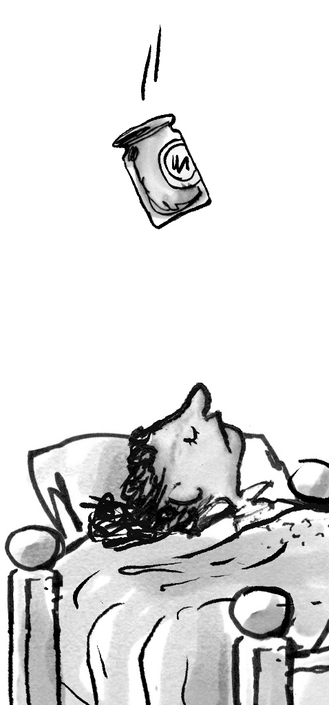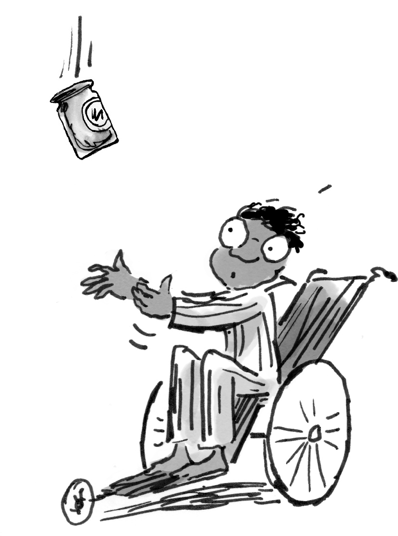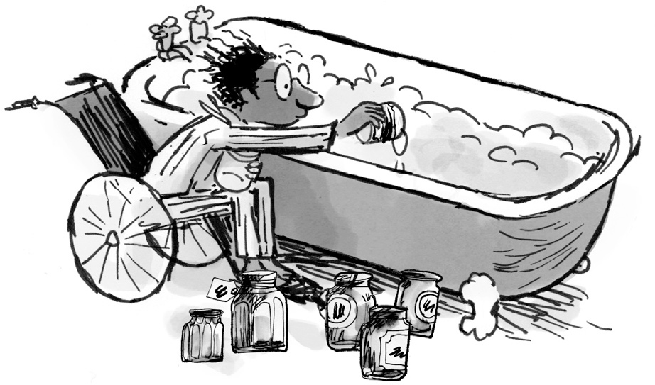Taking great care, the boy rolled himself back out of Jemima’s bedroom. He had to reverse his wheelchair, as with the mountains of jars there wasn’t room to turn round.