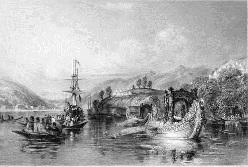 A circumstance almost as incredible, in modern times, has rendered the Giant’s Mountain famous. It is now ten centuries since the Russians, in their log-boats, made the first attempt on Constantinople, and their squadrons advanced to the Balkan Mountains. As they became a more civilized and powerful people, the attempts were made with more probability and perseverance; and Peter the Great, having Archangel on the White Sea, and St. Petersburg on the Baltic, conceived the hopes of rounding his vast empire by annexing Constantinople as his southern port, and so commanding all the seas that encircle it. Since that time, the great policy and ambition of the Russians seemed directed to this object; but while all Europe were anxiously watching their hostile approaches, and the desperate struggles of the Turks to resist them, people saw with astonishment a large fleet and an immense army quietly approach the capital, and disembark, not as enemies, but as friends and protectors; and, after an interchange of amity and good will between these deadly enemies, the one departed as peaceably as they came, and the other erected a monument as an everlasting memorial of their visit. It was at this interesting moment the Illustration was made, while the tents of the Russians whitened the mountains above, and the treaty of Hunkair Iskelessi was signed in the valley below. It represents the splendid caïque of the sultan returning from a friendly visit to his new allies, and the crowded boats of the Bosphorus “suspending the dashing oar,” as the homage paid to his passing.