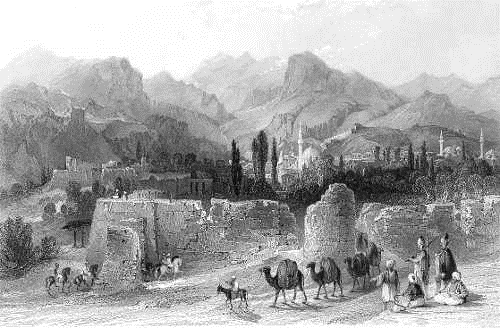 The town stands upon a hill, and, like all Greek cities, ascends to an acropolis. Around the base expands a singularly rich country, even now in a high state of cultivation, divided into gardens and vineyards, and beyond them one of those verdant and fertile plains which distinguish Asia Minor. There are few remains of antiquity which mark the era when Grecian art flourished. Such walls and masses of masonry as now stand, belong to the time of the Lower Empire. Among the barbarous remnants of those times is a wall of human bones, cemented together, near the town, and said to be evidence of the massacre perpetrated by Bajazet, who formed the structure as a monument of the terrible effects of resisting his wrath. It is a companion for the pyramid of human heads which his rival Tamerlane erected on similar occasions.