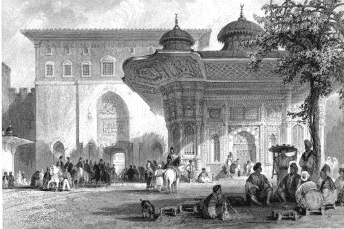 Between the fountain and one entrance to the mosque of Santa Sophia is seen that of the seraglio. This gate, distinguished by its lofty arch, was therefore called Babu Humayun, or “the high door,” by the Turks, which the French translate into “Sublime Porte:”18 the term has become a designation for the cabinet of Turkish diplomacy, as before noticed. The gate was originally erected by Mahomet II. when he entered the Christian capital, and converted the residence of the priests of Santa Sophia into a palace for himself. It consists of a massive and clumsy pavilion, formerly crowned with turrets; it is pierced by the high door from which it takes its name, and under the arch is an inscription on a broad tablet. Above are one large and three smaller apertures for windows at each side, and below, the dead wall is excavated by two deep niches. It has undergone changes for improvements, but it still resembles rather the strong-hold of a military station, than the great entrance to the most extensive and gorgeous palace in the world; yet it is from hence the sultans of the East for centuries dictated to the sovereigns of Europe, and issued the mandates of the “high door” from the city, or of “the imperial stirrup” from the field.