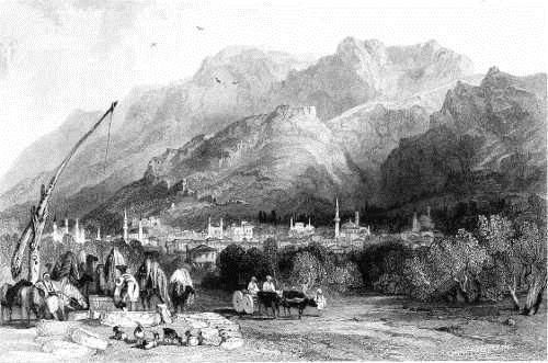 The city of Magnesia was founded by Tantalus, whose fabled punishment renders his name so notorious in the world. The situation is striking; it stands near the foot of a lofty mountain, on the edge of a vast and fertile plain, and its site and soil resemble those of Brusa; but it wants those important advantages which the other enjoys. The ridges of Sipylus afford no perennial snows like those of Olympus, to refresh the inhabitants below; nor is there any solution of the frigid element, to ripple in copious currents through the streets, or meander through the fertile plain. Its site, however, is very beautiful. Above it rise in majestic grandeur the rugged and romantic precipices of a mountain once celebrated for its thunder and lightning, and which still seem to be the shattered and splintered effects of those electric storms; and below it, lies one of those vast and exuberant levels, which, in Asia Minor, are found at the base of its hill, endued with the capabilities of all the luxury of life. This majestic plain is eight or ten miles in breadth, and fifteen in length. Through the centre flows the river Hermus, which, like the Pactolus its tributary stream, abounds in auriferous sands, but, like the Nile, has the more valuable property of fertilizing its soil, and, by the deposit of its rich mud, producing golden harvests. This was so remarkable formerly, that medals in honour of the river were struck, representing its course; having on one side the branch of a fruit-tree, and on the other a cornucopiæ, emblematic of its abundant produce. The fate of Turkey has, however, now blasted it. The luxuriance of a wild vegetation covers its corn-fields, and its former crops are converted into groves of tamarisk; still it abounds in many indications of its former state. Gardens and vineyards cover extensive spaces, verdant pastures are filled with snow-white sheep, and the landscape is varied by herds of those sable goats peculiar to Anatolia, whose dark and silky coats contrast in so striking a manner with their woolly companions. The camel is nowhere more noble and majestic. The breed is here particularly attended to. They are seen gaily caparisoned, winding in long lines through the plains, laden with Oriental produce for exportation, to the mart of Smyrna, where the camel of Magnesia is particularly prized and admired.