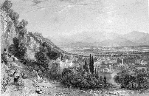 The rich valley through which this river winds its way, was formerly filled with many famous cities, and some distinguished for that luxury and effeminacy which a balmy climate and a fertile soil are apt to generate. Tralles and Alabanda sent from hence their swarms of “esurient Greeks,” with their cargoes of figs and prunes, to taint the Roman citizens, already sufficiently corrupt. Notwithstanding the desolation which Turkish indolence and barbarism brought into these fertile regions, the active spirit of the ancient Greeks still seems to animate their oppressed descendants. The whole plain is seen by the traveller in the highest state of cultivation: corn, wine, and oil, the evidence and emblem of fatness and fertility, are now abundant here, as in the days of the free Greek cities,−pastures covered with sheep and oxen, fields waving with golden crops of wheat, vineyards bending under vast clusters of grape, and gardens shaded by the broad foliage of the fig, are still the prospects which present themselves.
